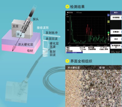 與母材相比,淬火層的結(jié)晶組織細(xì)微,超聲波通過細(xì)微化的淬火硬化層,在母材上產(chǎn)生散射,用于檢測各類鋼制材料表面感應(yīng)淬火硬化層的深度。